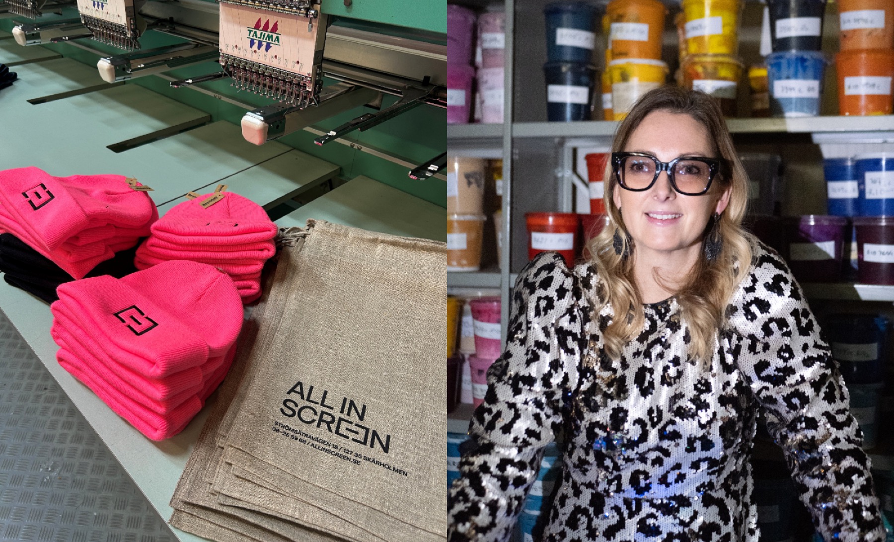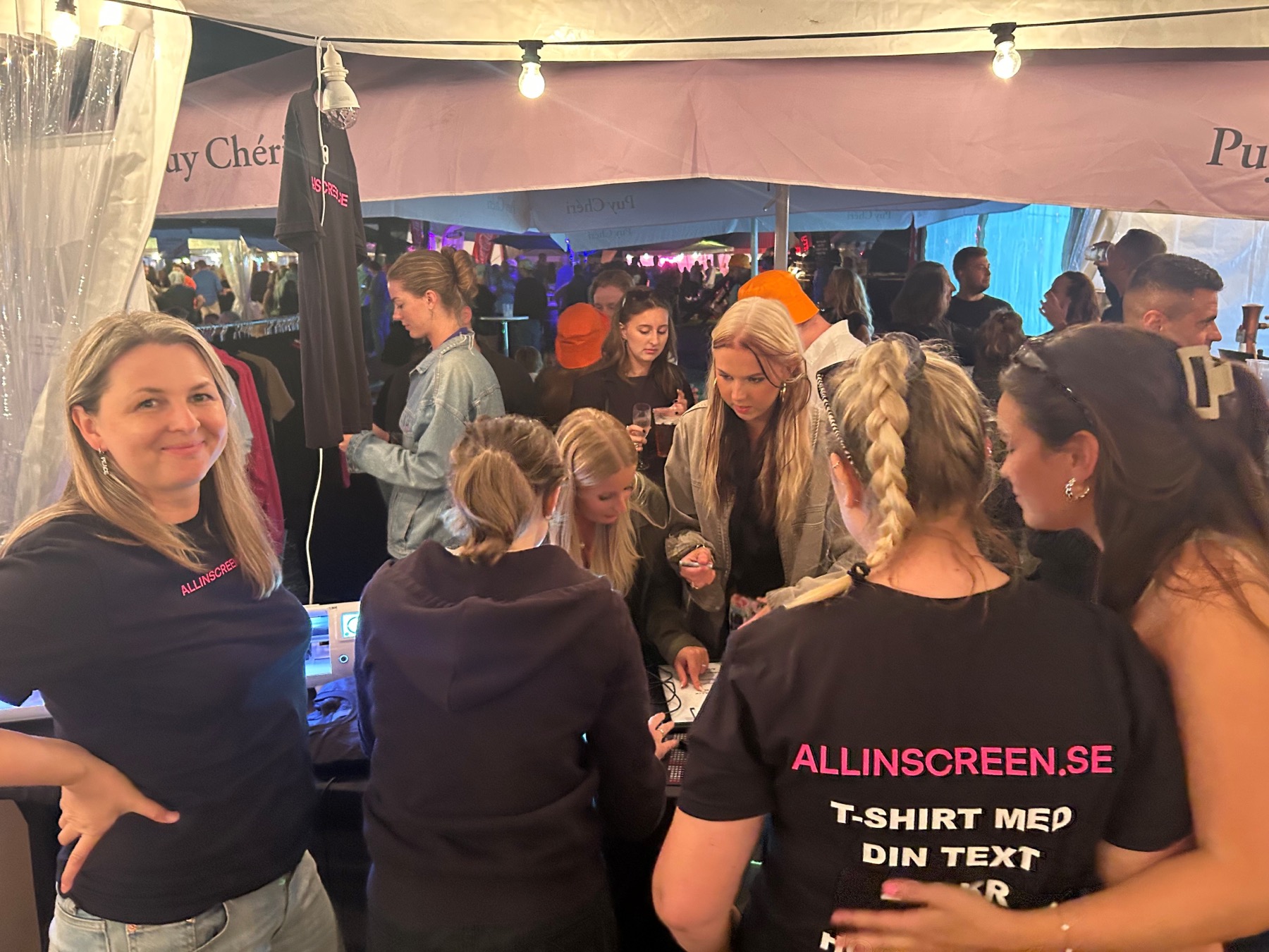 Festen hade öppen produktion, vilket innebar att gästerna fick uppleva verksamheten på nära håll. Gästerna prova på att brodera mössor, trycka t-shirts och värma på tygkassar – allt förädlades med All in Screens nya logga och gäster fick med sig produkterna de förädlat i en goodiebag.