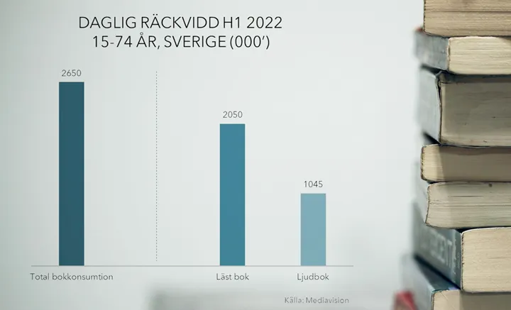 Mediavision följer löpande svensk bokmarknad och hur konsumenterna väljer att konsumera böcker. En genomsnittlig dag första halvåret 2022 (januari-juni) läste eller lyssnade drygt 2,6 miljoner 15-74 åringar på böcker¹. Och då är läromedel inte inräknade.