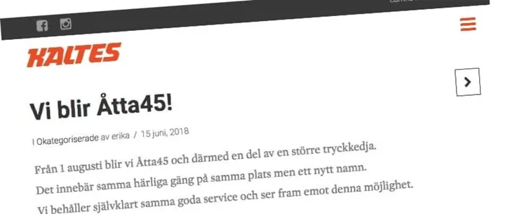 För snart fyra år sedan ingick Åtta.45 ett avtal om att ta över Tryckeribolaget i Sundsvall och nu ska Kaltes, "enda tryckeriet med arkoffset i Sundsvall", också gå in under åtta.45s paraply och utnyttja stordriftsfördelarna i Veddesta norr om Stockholm.