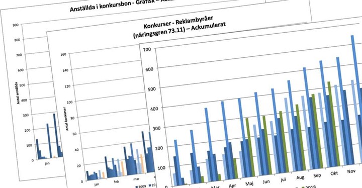Konkurserna i näringslivet ökar – och så även i flera andra delar av kommunikationsbranschen. Men den grafiska branschen står som undantag. Här är alla aktuella siffror med diagram för grafiska branschen, byråer och förlag.