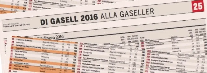 Dagens Industri presenterade i december 2016 års gaseller – Sveriges bäst växande och lönsamma bolag. Sex av de drygt 900 bolagen på listan finns i år i den grafiska branschen. (Bild: Klipp från bilaga med alla vinnare)[/caption]I år utsågs sex grafiska företag till gasellföretag av Dagens Industri. Företaget Medtryck som erbjuder promotionprodukter med tryck växte mest. För att komma med på listan ska man minst ha dubblat omsättningen mellan 2012 och 2015.