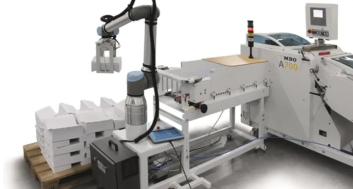 MBO, som tillverkar falsmaskiner, visade lösningen "CoBo-Stack" första gången i maj på ett öppet hus i Tyskland.Roboten jobbar självständigt med att packa buntar från falsmaskinen på pall. Den jobbar åt flera håll och kan därmed packa på två pallar parallellt.Lösningen är väldigt lik den Lasertryk implementerade för ett antal år sedan – med en robotarm från Universal Robots och falsmaskin från MBO.