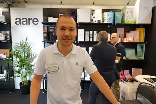 Alexander_Borg_Aare_01Empack: På Empack-mässan visade företaget Aare upp sin portfölj med fantastiska produktioner. Allt från förpackningar, till inbjudningar och visitkort – alla med det gemensamma att de har det där lilla extra med till exempel foliering, lamineringar, stansning, präglingar eller helt enkelt bara en handklädd låda med perfekt passform.– När man gör det lilla extra med en förpackning eller annan trycksak så skapas en speciell känsla som gör att produkten sticker ut, säger Alexander Borg som stod i Aares monter på Empackmässan.Aare jobbar med både screentryck och digitaltryck.Länk: Aare.se