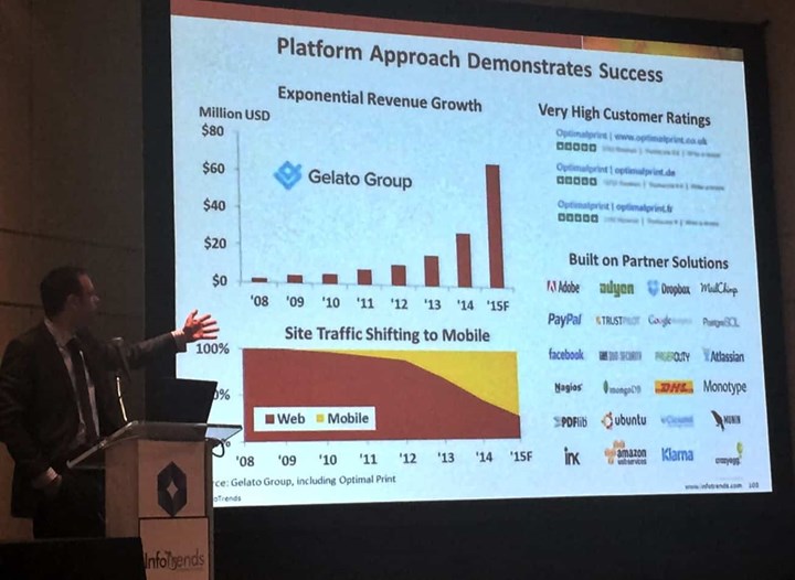 Gelato_InfotrendsGraph Expo: Med nuvarande tillväxt når man närmare 200 miljoner kronor i omsättning under 2014 – med god vinstmarginal – och ambitionen för det 8 år gamla bolaget är att redan 2015 omsätta 450 till 500 miljoner. På vissa marknader kommer redan 70 procent av all trafik från mobiler och surfplattor. Siffrorna gäller för norska Gelato Group som byggt ett globalt ”print cloud” som levererar trycksaker till snart 40 länder – Australien och Canada lanseras i början av oktober.På måndagen genomförde analysföretaget Infotrends sin traditionella branschfrukost på Graph Expo i Chicago med en uppdatering kring branschen, trender och mässan. Under ämnet mjukvaror och lösningar fick Gelato Group, som driver Optimalprint, Gelato Air och Gelato Cloud, stor uppmärksamhet för sitt globala plattformsupplägg. Med avancerad mjukvara och hundratals samarbetspartners kopplar man ihop de delar som behövs för att, som man säger, skapa en helt ny global plattform för grafisk produktion.Befintlig infrastruktur av tryckerier och logistikföretag kopplas ihop med publicerings- och betallösningar med stort fokus på mobilitet. Under 2015 tror man att mobila enheter kommer fortsätta att revolutionera den grafiska industrin.Företaget Gelato Group är ett norskt bolag med svenske Henrik Müller-Hansen (LinkedIn) som vd och uppbackat av många internationellt aktiva och starka investerare.Här beskriver man tjänsten Gelato Cloud, som vänder sig till hela värdekedjan av tryckerier och trycksaksköpare, på 60 sekunder:[vimeo]http://www.vimeo.com/107183940[/vimeo]På bilden: Kaspar Roos på InfoTrends traditionella branschfrukost på Graph Expo i Chicago/Ulf SunnbergUlf Sunnberg (LinkedIn) jobbar som konsult inom publishing och grafisk kommunikation i bolaget South Bridge/Clear Edge. Han är ordförande i nätverket GrafKom och medgrundare till Mcro the Print Liberation Company. Ulf har tidigare arbetat på Statskonsult, Aldus, Adobe och EFI.