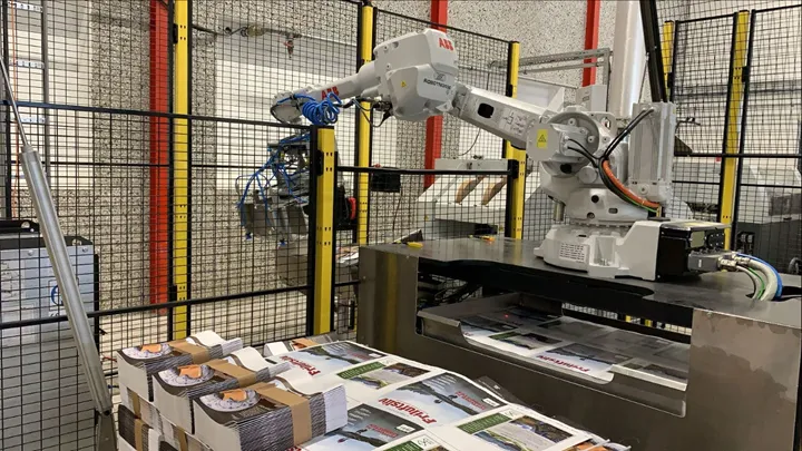 Ålgård Offset producerar 500 miljoner tidningar och rekklamblad varje år och nu förbättrar man både arbetet för medarbetarna och effektiviserar verksamheten genom att palletering sker med hjälp av robotar.
