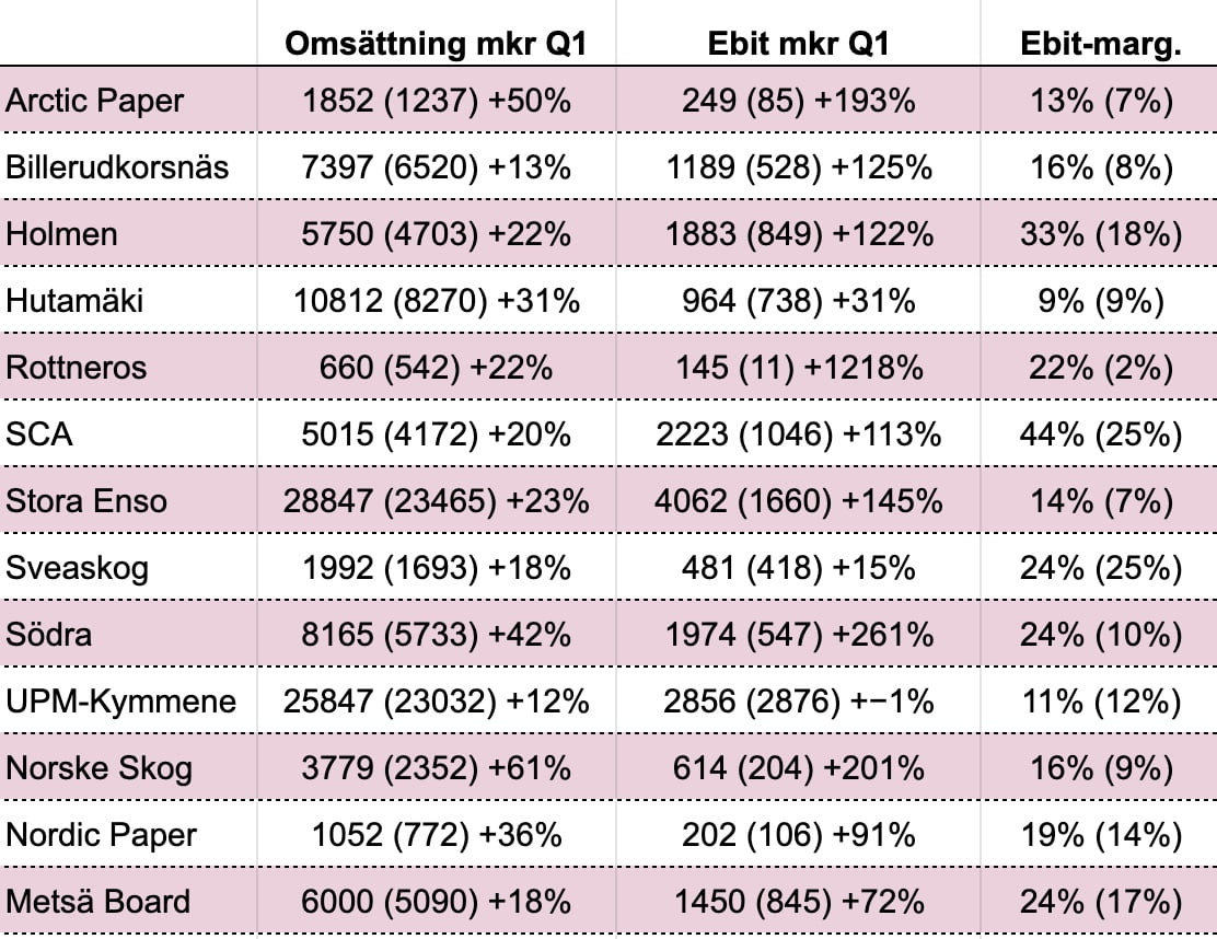 Skogs- och pappersbolagen har nu kommit med kvartalsrapporter för det första kvartalet 2022. Sammantaget kan man säga att det går väldigt bra för i stort sett alla bolag. Många har ökningar av ebit på över hundra procent jämfört med samma period i fjol.